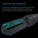 - Detachable stem enables secure sensor placement deeper in soil. IP67-rated for sealed protection against liquids and dirt.