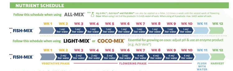 What is Fish·Mix?This rich infusion of organic fish emulsion from the North Sea, mixed together with extract of 100% organic Dutch sugar beet, helps accelerate the growth of all living organisms in the substrate. It also stimulates the production of microorganisms and useful bacteria in all types of soil and coco-based substrates. And it’s good to know that, in keeping with our strict organic farming requirements, Fish·Mix is not extracted with acids or stabilised with BHT (butylated hydroxytoluene) – a synthetic preservative. How to use it?You can use Fish·Mix on all kinds of plants during the first stages of growth, and during the flowering period until harvest. After a few days of use, it will have transformed poor quality earth into rich, fat soil – full of the natural minerals your plants are hungry for. It’s also mild enough to be used in the first stages of a plant’s life or sprayed directly onto leaves during the vegetative growing cycle. If you want to use Fish·Mix with your All·Mix then our advice is to measure a 1ml dose of Fish·Mix per litre of water. For Light·Mix, increase the amount to 2-4ml per litre of water. Follow our official Nutrient Schedule for the best results.