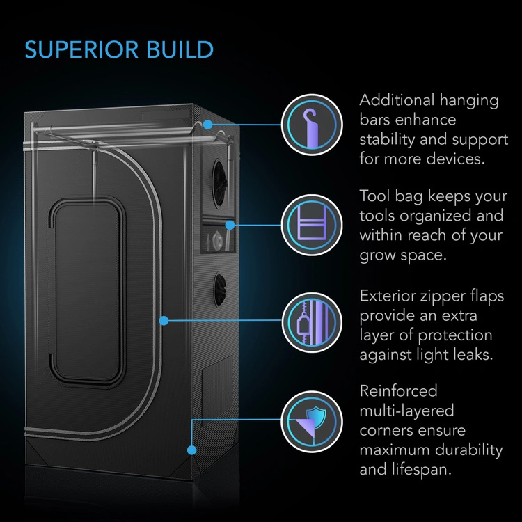 Constructed with ultra-durable 2000D oxford canvas, the CLOUDLAB grow tent also features reinforced 22 mm diameter poles—stronger than the standard 18 mm poles used in most grow tents. Featuring additional hanging bars, the tent is built to support up to 250 pounds (113 kg) of heavy equipment for long-term use. Reinforced tent corners and a heavy-duty floor tray provide added strength and protection, while the front zipper flaps and 500G light-proof layer offer another level of defense against light leaks. Organize your grow accessories inside or outside the tent using the convenient detachable tool bag. Additional cinched duct ports allow you to easily install humidifiers, heaters, or A/C units without compromising the seal.