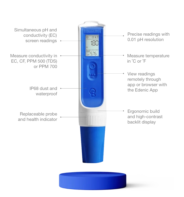 To narzędzie 3 w 1 mierzy pH, przewodnictwo (EC/PPM) i temperaturę, optymalizując wchłanianie składników odżywczych. Połącz się z aplikacją Edenic przez Bluetooth, aby udostępniać dane w czasie rzeczywistym, aktualizować je i kompleksowo nimi zarządzać.