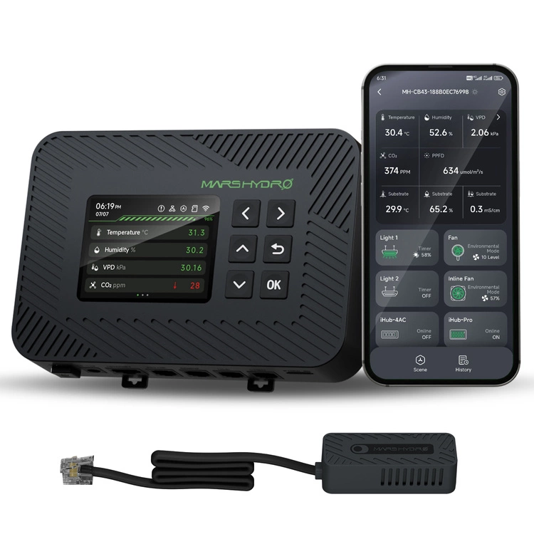 Mars Hydro iControl obsługuje również dodatkowe czujniki – CO₂, PPFD czy wilgotności gleby – które rozszerzają jego funkcjonalność i pozwalają precyzyjnie kontrolować środowisko. Czujnik CO₂ umożliwia monitorowanie poziomu dwutlenku węgla, kluczowego dla intensywnej fotosyntezy, a sensor PPFD (PAR) mierzy ilość światła w zakresie aktywnym fotosyntetycznie (400–700 nm), co pozwala dopasować natężenie oświetlenia do aktualnych potrzeb roślin.
