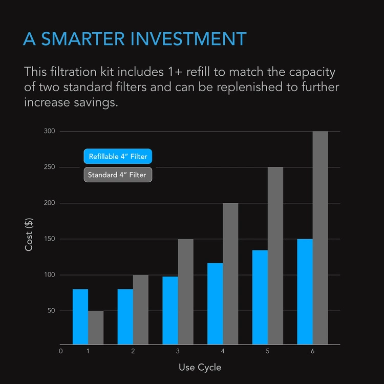 Ten pierwszy w swoim rodzaju system filtracji eliminuje konieczność regularnego zakupu filtrów zamiennych i utylizacji starych urządzeń. Każdy filtr węglowy zawiera najwyższej jakości australijski węgiel drzewny virgin i jest dostarczany z wkładem 1+. Węgiel aktywny charakteryzuje się zwiększoną powierzchnią i wyższym współczynnikiem adsorpcji, co pozwala wydłużyć czas między uzupełnieniami. Żywotność wkładu węglowego można dodatkowo wydłużyć, odwracając łatwe do demontażu kołnierze filtra. Zużyty wkład można kompostować podczas wymiany węgla drzewnego, aby jeszcze bardziej zmaksymalizować jego użyteczność.