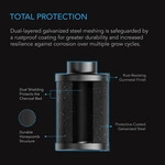 Węgiel aktywny jest bezpiecznie zamknięty w filtrze zapachów za pomocą aluminiowych kołnierzy i solidnej gumowej uszczelki. Sam filtr wykorzystuje dwie warstwy ocynkowanej siatki stalowej z piaskowanym wykończeniem, aby chronić warstwę węgla drzewnego. Te liczne warstwy współpracują ze sobą, aby skutecznie blokować zapachy nawet w najbardziej wilgotnych środowiskach, zapewniając zwiększoną odporność na rdzę i korozję.