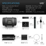 - Rozmiar kanału zestawu: 200 mm | Przepływ powietrza wentylatora: 807 CFM / 1370 m3/h| Hałas 42 dBA | Grubość węgla: 38 mm | Długość kanału: 7,62 metra