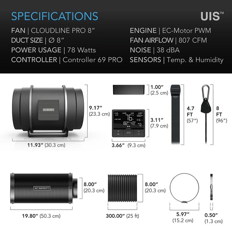 ZESTAW AC INFINITY 200 MM DO FILTRACJI POWIETRZA: WENTYLATOR KANAŁOWY 2000MM 1370 m3/h I INTELIGENTYM KONTROLEREM C69 PRO, FILTREM WĘGLOWYM I PRZEWODAMI WENTYLACYJNYMI
