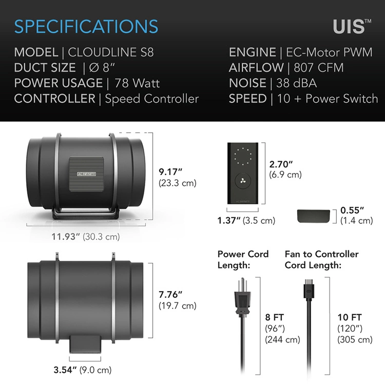 Bardzo cichy wentylator kanałowy AC Infinity CLOUDLINE PRO S8 Quiet Inline 200mm 1370m3/h - wentylator odporny na kurz i wilgoć z opcją programowania i kontrolerem prędkości