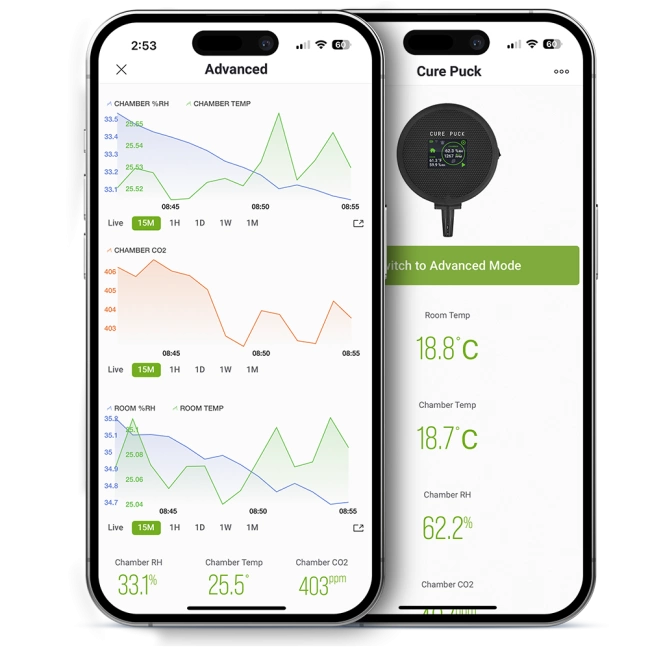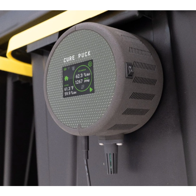 Twister Cure Puck to inteligentne urządzenie IoT zaprojektowane do optymalizacji procesu suszenia i dojrzewania suszu (curring). Monitoruje w czasie rzeczywistym kluczowe parametry środowiskowe wewnątrz pojemnika oraz w pomieszczeniu, automatycznie odpowietrzając pojemniki w razie potrzeby.