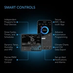 - Kontroler automatyzuje wentylacje i światło za pomocą indywidualnych programów, aby dynamicznie regulować prędkość i jasność.