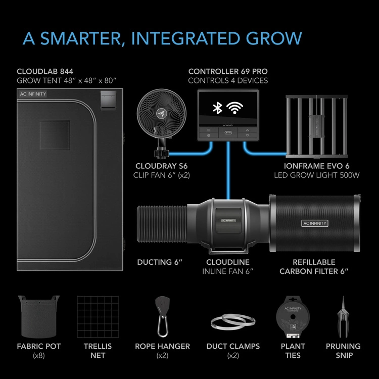 GOTOWY GROWBOX OD AC INFINITY: NAMIOT CLOUDLAB 844 120X120X200 CM Z WENTYLACJĄ: WENTYLATOR KANAŁOWY 150MM 600 m3/h, FILTR WĘGLOWY PREMIUM 700 m3/h, WIATRAK MIESZAJĄCY, INTELIGENTNY KONTROLER C69 PRO ORAZ LAMPA LED IONFRAME EVO6 500W Z DIODAMI FULL SPECTRUM SAMSUNG LM301H EVO
