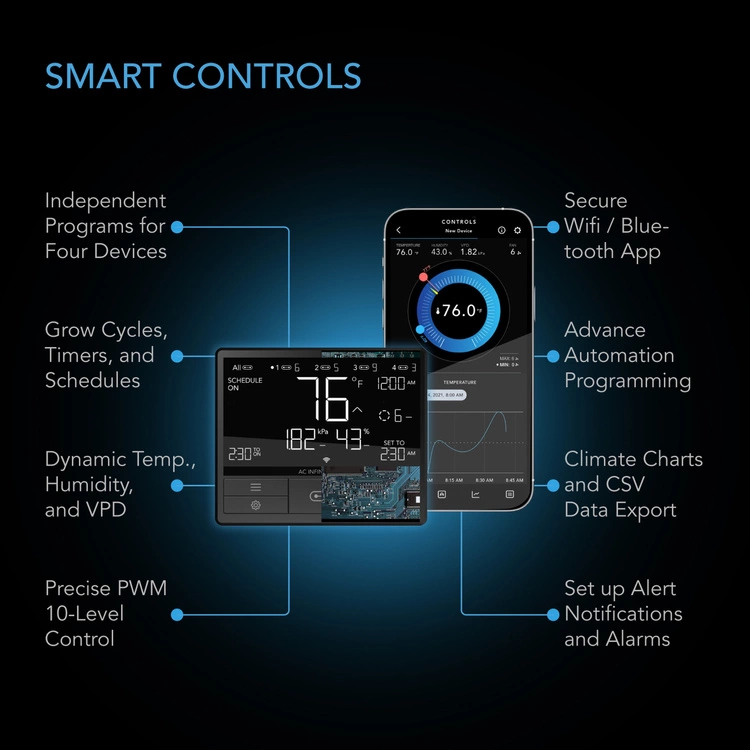 Podłącz maksymalnie cztery urządzenia, aby zapewnić każdemu możliwość wspólnego lub niezależnego programowania. Wyjdź poza podstawowe wyzwalanie włączania/wyłączania, ustawiając programy dynamiczne, które dostosowują prędkość wentylatora i natężenie światła w odpowiedzi na zmieniającą się temperaturę, wilgotność i VPD. Ustaw minimalne poziomy bazowe, na których będą stale działać Twoje urządzenia, zwiększając je tylko po aktywowaniu wyzwalaczy. Tryby timera, cyklu i harmonogramu umożliwiają niestandardową aktywację na żądanie dla różnych zastosowań związanych z uprawą w pomieszczeniach. Bezpiecznie połącz się z aplikacją AC Infinity przez Bluetooth lub Wi-Fi, aby uzyskać zdalny dostęp do swoich urządzeń, odblokować zaawansowane programy, ustawić alarmy, powiadomienia, przeglądać wykresy historyczne i eksportować pilki CSV.